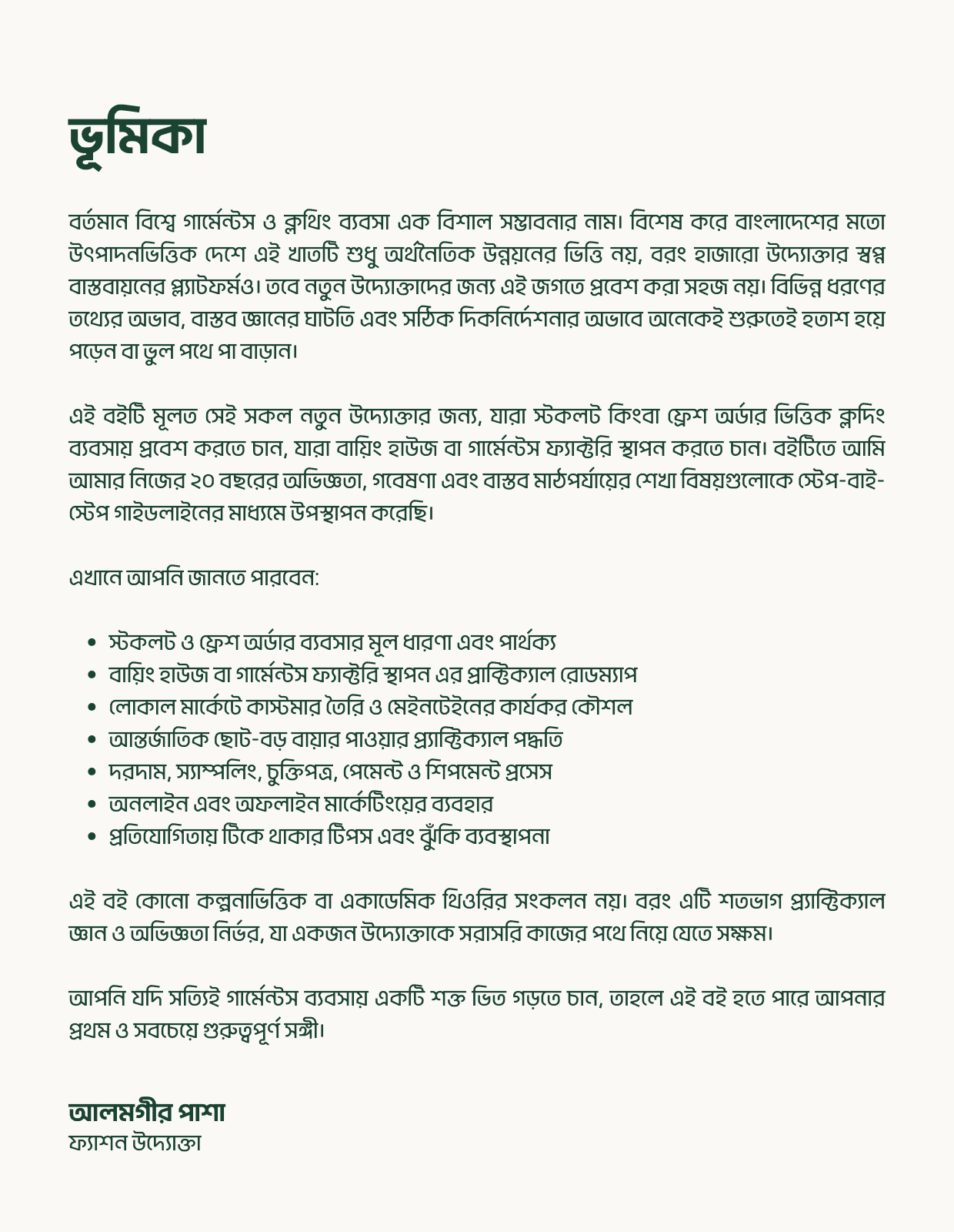 এই বইটি মূলত নতুন উদ্যোক্তাদের জন্য লেখা হয়েছে যারা অল্প পুঁজিতে বা কোনো পুঁজি ছাড়াই ক্লথিং ব্যবসা (যেমন: স্টকলট, বায়িং হাউজ, মিনি গার্মেন্টস) শুরু করতে চান। ছাত্র, চাকরিজীবী বা যে কেউ, যার এই ব্যবসা সম্পর্কে কোনো পূর্ব অভিজ্ঞতা নেই, তিনিও এই বই পড়ে শুরু করতে পারবেন।